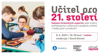 Ministr školství Robert Plaga a jeho možní nástupci v čele resortu budou hosty předvolební debaty „Učitel pro 21. století“, kterou 8. června pořádá nezisková organizace Učitel naživo. Zástupci devíti politických stran budou diskutovat o zásadních problémech českého vzdělávacího systému - nedostatku učitelů a kvalitě jejich vzdělávání. Cílem organizátorů je přivést pozornost k systémovým řešením problémů, která nabízí předvolební výzva odborníků Domácí úkoly 2021.