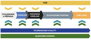 Oblasti graficky znázorněné uprostřed nákresu odkazují na samotnou profesní dráhu ředitele. Klíčová opatření se musejí zavést už ve fázi vyhledávání a přípravy – je potřeba začít systematicky budovat pool kandidátů a motivovat kvalitní uchazeče, např. vytvořit databázi a proces oslovování potenciálních kandidátů na ředitele školy s nabídkou výběrových řízení.