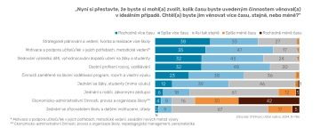 Naopak nejméně svého času tráví ředitelé a ředitelky škol osobním rozvojem a vzděláváním. Až 2/3 vedení škol jím tráví méně než 5 % svého času. Přitom 80 % ředitelek a ředitelů uvedlo, že by osobním rozvojem chtěli trávit více času. V ideálním případě by většina ředitelek a ředitelů chtěla trávit více času čtyřmi činnostmi: kromě osobního rozvoje (80 %) také strategickým plánováním a vizí školy (71 %), motivací a podporou učitelského sboru (82 %) a sledováním dopadu výuky na žáky (75 %). To jsou činnosti, které definují pedagogický leadership škol a shoda na nich je zásadním zjištěním tohoto výzkumu. Je zároveň zprávou o tom, čím by ředitelky a ředitelé chtěli být a které činnosti považují za nejdůležitější pro kvalitní výkon vedení školy.
