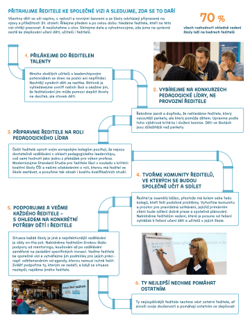 Čeští ředitelé mají míru odpovědnosti a kompetence jako nikde ve světě. Až 70 % všech rozhodnutí ohledně vedení školy leží na bedrech jich samotných. Tak vysoká míra autonomie ředitelů škol je naprosto ojedinělá. Když s ní ředitelé umí dobře pracovat, je to obrovská příležitost, když to však neumí, jde o obrovské riziko. Přesto náš systém ředitele dnes dostatečně nepodporuje a ani neřídí jejich kvalitu.