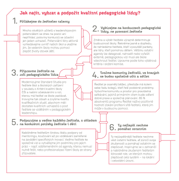 než jaký si mnozí učitelé zvolili, tedy učení a kontakt s dětmi. Tato bariéra může být částečně zmírněna potlačením činností spojených s administrativní správou školy a vyhrazením prostoru přímo pro výuku. Tento krok se obtížně realizuje na menších školách s nízkým počtem zaměstnanců, ale na větších školách je možné některé administrativní úkoly delegovat. Zásadní dopad by nicméně mělo především systémové odbřemenění ředitelů od jejich administrativní zátěže. Odstranění části činností v oblasti administrativy by také vytvořilo ředitelům prostor pro pedagogické vedení školy – tedy pro práci se sborovnou a celkové zvyšování kvality výuky a jejích dopadů na děti u všech učitelek a učitelů ve škole.